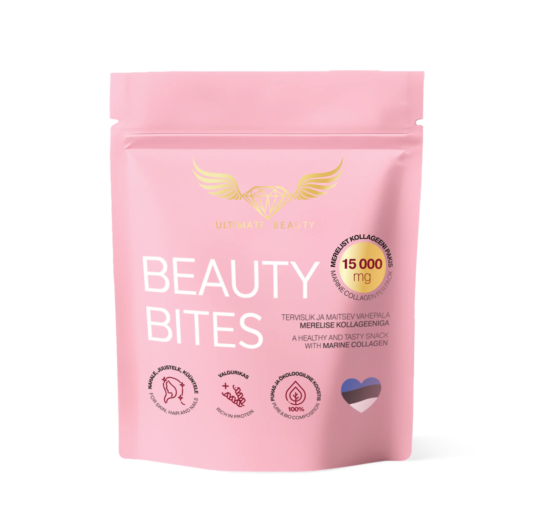 Beauty Bites on luotu herkulliseksi välipalaksi kiireisen päivän aikana, ja se sisältää orgaanisia ja erittäin puhtaita ainesosia, kuten makeita taateleita, kermaista mantelivoita, makeaa agavenektaria, rapeita kookoslastuja ja pakastekuivattuja mansikoita sekä 15 000 mg merikollageenia.